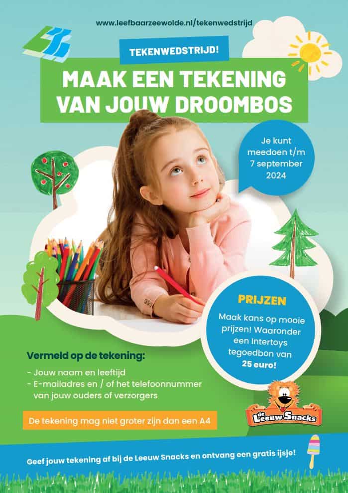 Leefbaar Zeewolde nodigt alle kinderen van 15 jaar en jonger uit om mee te doen aan een tekenwedstrijd. Fractievoorzitter Tom Zonneveld: “Laat je creativiteit de vrije loop en maak een tekening van jouw droombos! Lever je kunstwerk uiterlijk 7 september in bij De Leeuw Snacks en ontvang een gratis ijsje. Daarnaast maak je kans op prachtige prijzen!”